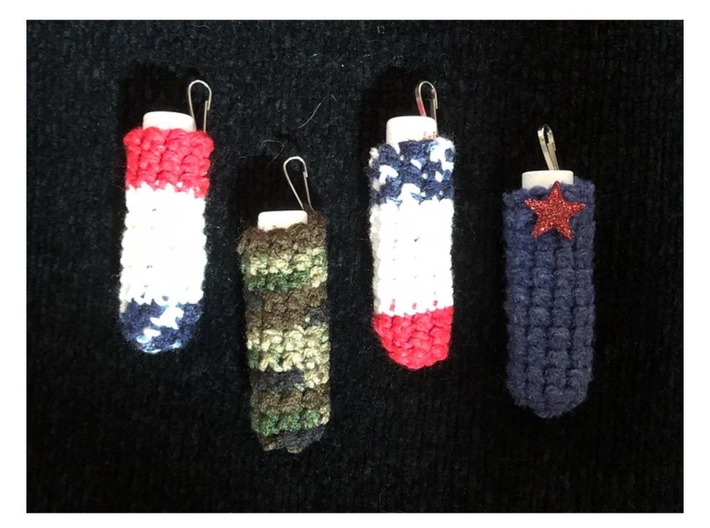 Today, I still crochet lip balm holders, but I add a lip balm to them and tie them on to gifts/packages as a little “extra“, hand them out to the homeless folks that stand along stopped traffic, or donate them to charity events.