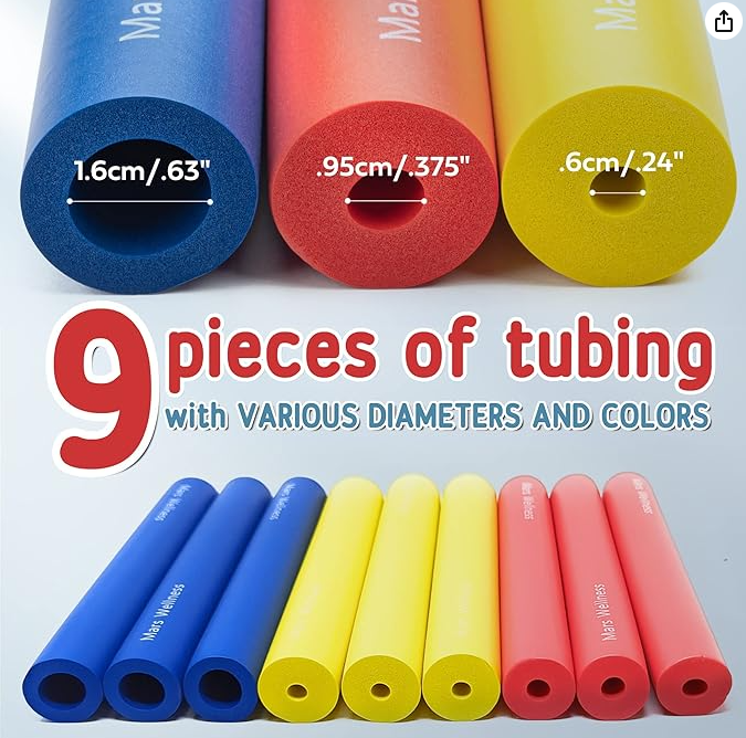 These are sold on Amazon for $12.99 and you get 9 tubes, which are 8″ long. I cut each one in half and was able to get 12 crochet handle grips from the yellow and red ones. I did NOT use the blue ones (yet) as the hole is too large for any of the hooks I use at this time. For context, these are foam, not silicone, and seem to be more like the softer, version 2 Chunky Boy grips as they are described.