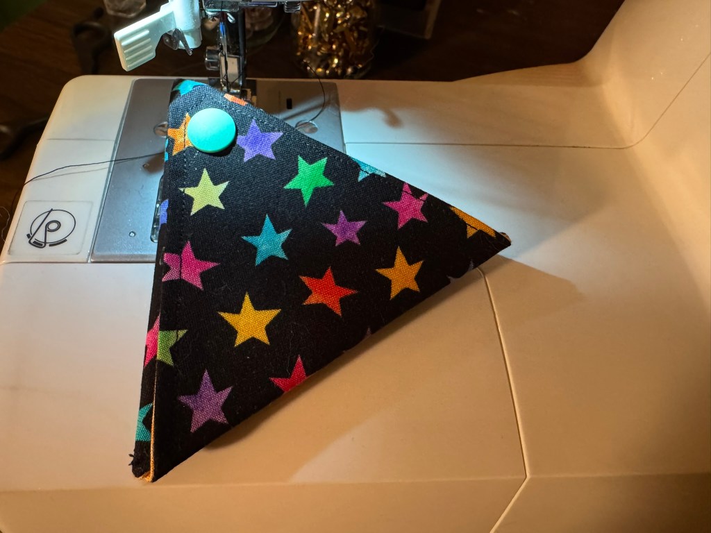After this one turned out so delightful, I decided to get CREATIVE, so I QUILTED the fabric before making the triangle shape. It turned out REALLY cute, and I will be making a few more of those as well and will share their photos at that time. I gave my oldest granddaughter the stars one shown above, and promised to share the pattern and process with her, since she started sewing last year.