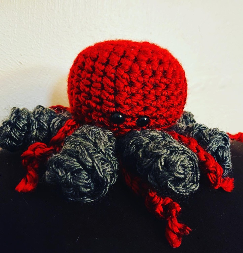 He is the LARGEST (to date,…!) of my crocheted octopus friends. He’s ALSO one that I’m very proud of! As it was in progress I was unsure as to whether it would come together as I had imagined, but it did!