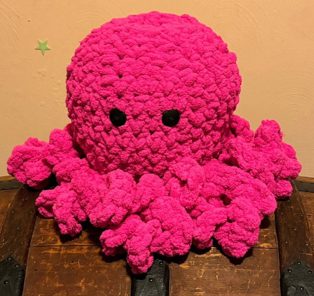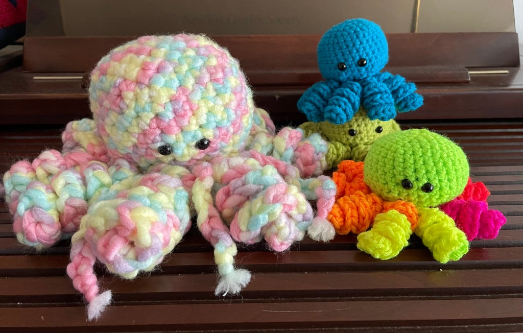 My youngest granddaughter ended up with the GIANT one in the photo, just above. I say “giant” because it DWARFS my other Octopus creations with a head larger than a basketball. It remains a fixture among her toys as she is a big fan of The Little Mermaid, who herself has an abundance of sea creatures as her friends. I sometimes find it challenging to shop for her on birthdays and other occasions, so I often make something themed to accompany her interests. I made this guy out of thick, Bernat blanket yarn and a Q hook.