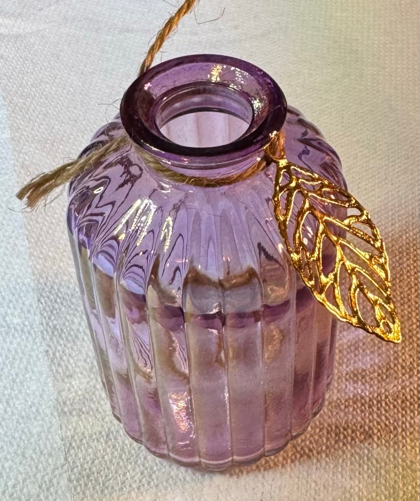 I didn’t care for the decoration on the bottle so I replaced it with a sheer pink ribbon and a purple sparkle star button, but will find another use for the metal leaf and recycle it into some other craft.