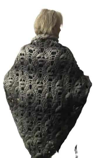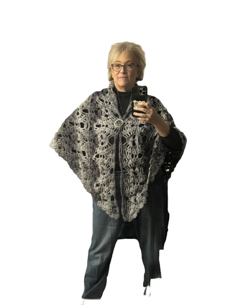 This past week I finished my Lost Souls shawl, and it ended up being wider across the top than the span of my arms. It is a LARGE shawl, and because I made it with Red Heart Ombré yarn (color: Anthracite), which is a worsted weight (4) yarn, it is a substantial garment!