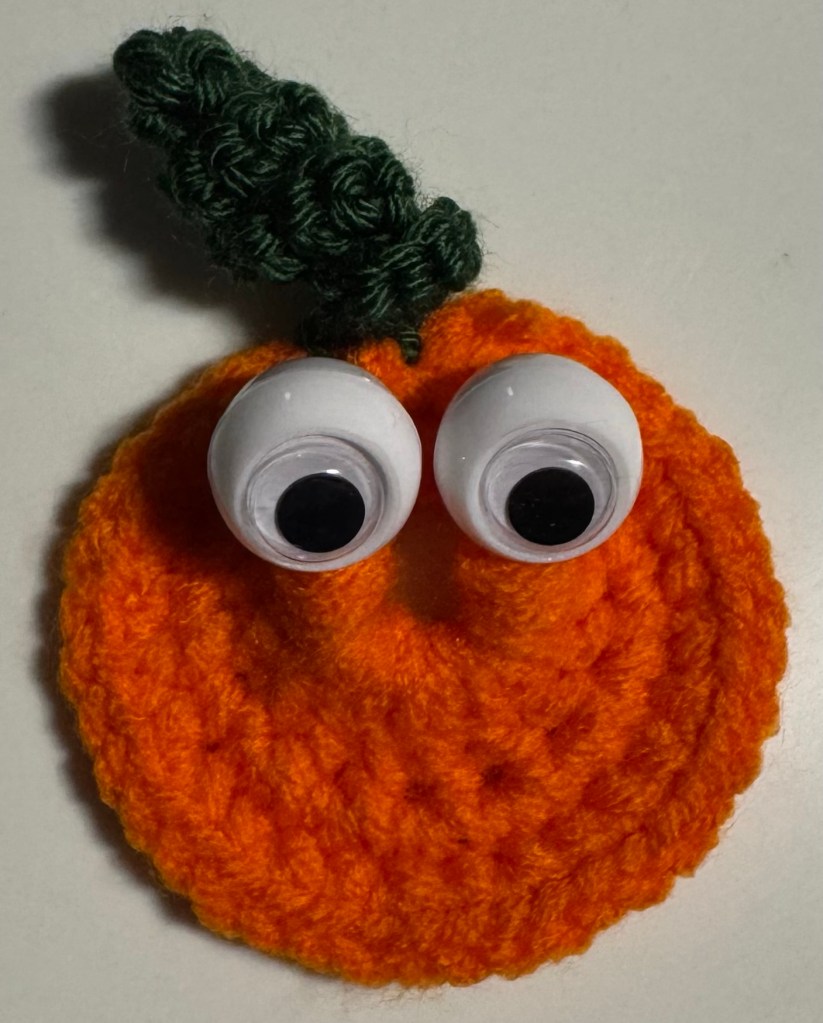 My recent foray into projects that use (mostly) stash supplies included me trying out the “googly eyes” craze. I saw a pumpkin crocheted around a pair of these eyes, and while I can’t find it again (and I’ve looked), I remembered enough of it to make one that I found to be acceptable.