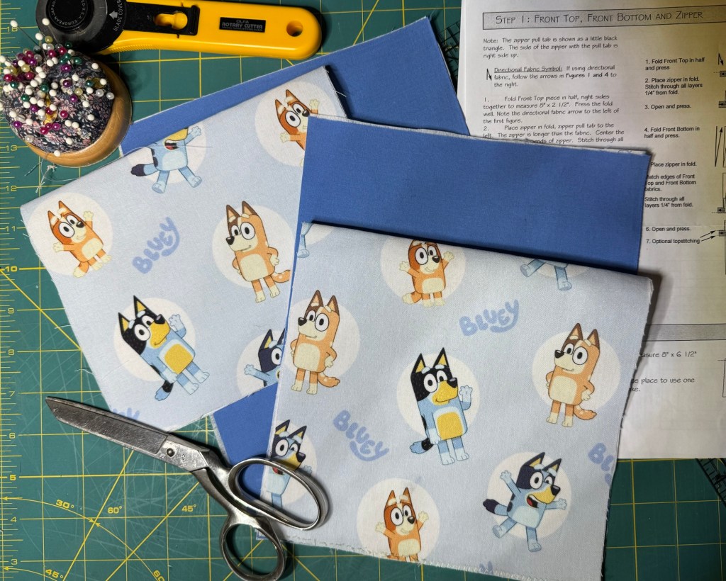 I’m also mid-project on a Bluey purse for my littlest grandbaby who loves the cartoon and its characters. I found a scrap of a Bluey remnant at our local Center for Creative Reuse and was able to match it to a piece in my fabric stash for the custom creation.