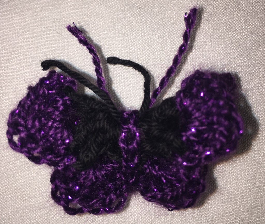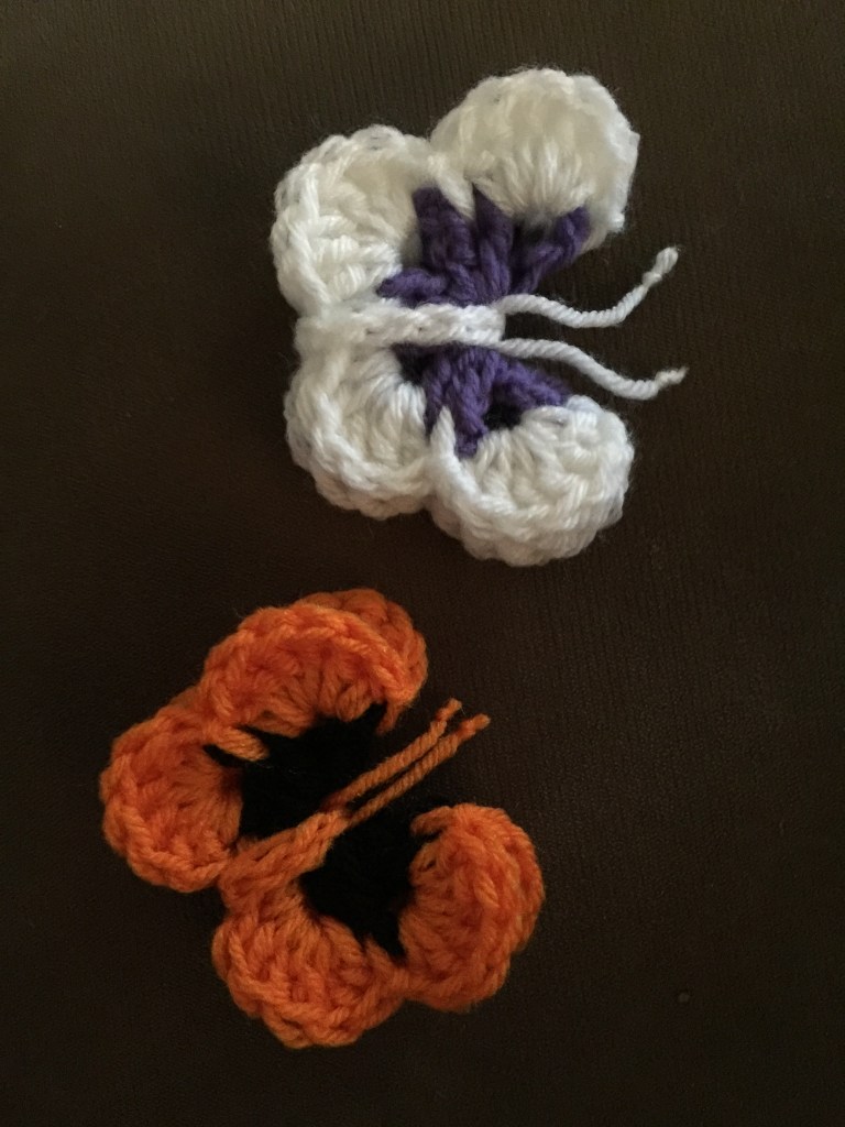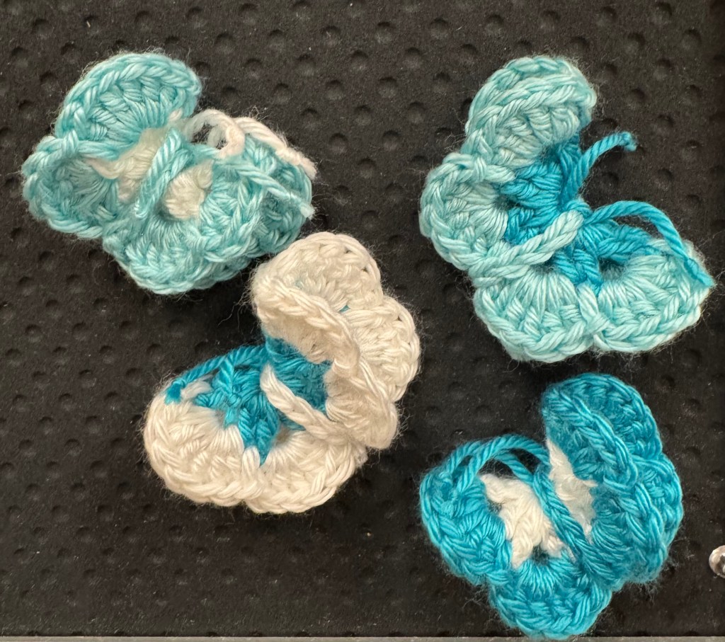 It was at that point that I decided to crochet butterflies for my Spring wreath, and knew that I had ribbon in my stash that would work beautifully for a Spring-themed wreath. I even thought about sewing a stuffed bird or two to round out the look. After all, I have plenty of fabric scraps, too.