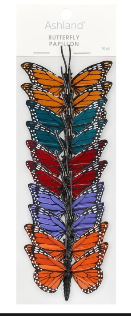 I was still wandering in Michaels and came across some butterflies on a card (10 pieces) for $15.99 (retail), and realized that if I continued, I could quickly spend $30 or more on supplies for my “home-made” wreath. It was starting to feel less like a craft project and more like an investment!