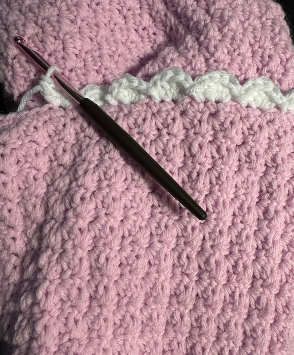 At that point I was already behind the 8-ball, so to speak, as it related to time. Not finding a pre-existing pattern that I liked, I turned to Co-Pilot (AI tool) and asked for a crochet baby blanket in Suzette Stitch, with a shell edging. I’ll share that in its entirety at the end of this post.